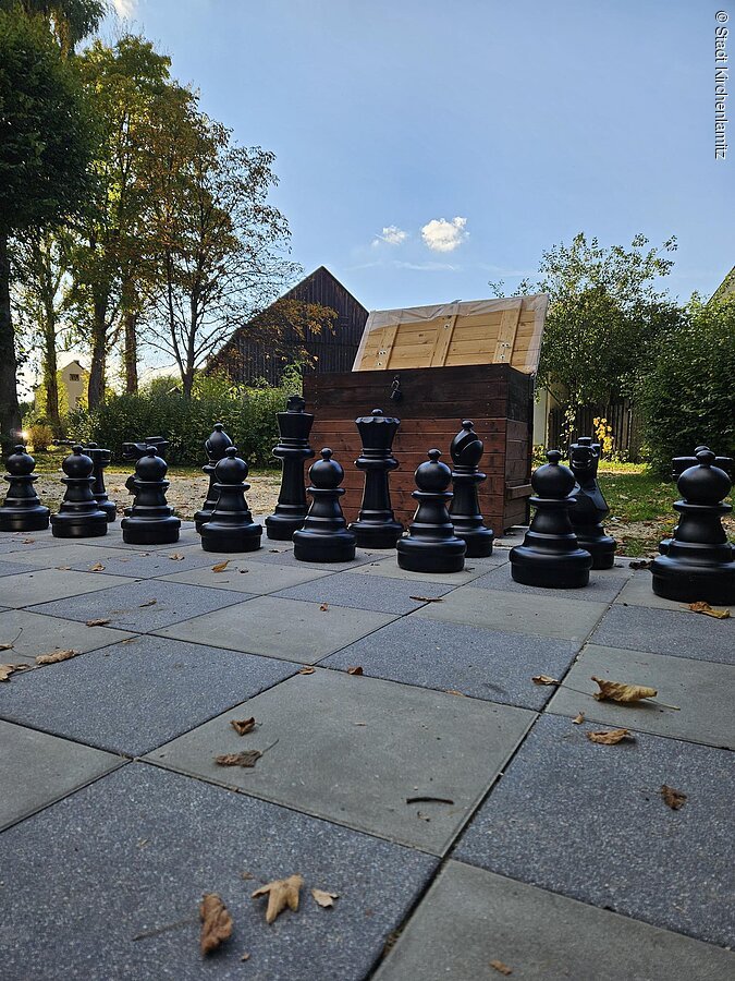 Das wetterfeste Spielfeld mit Figuren, Infotafel und Sitzgelegenheiten lädt zum Spielen und Verweilen ein.