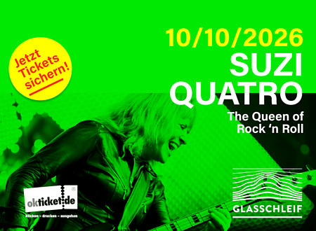 Am 10. Oktober 2026 ist ein besonderer Gast zu Besuch in Marktredwitz: die US-amerikanische Sängerin Suzi Quatro bringt ihr besonderes Flair der Rockkultur in die GLASSCHLEIF, Bauerstraße 3. Suzi Quatro ist seit den 1970er Jahren leidenschaftliche Musikerin und gehörte zu ihrer Zeit zu den erfolgreichsten Rockmusikerinnen. 1973 durfte sie ihren großen Solo-Durchbruch ...