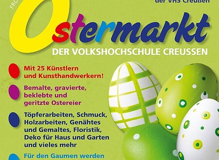 Der traditionelle Künstler-Ostermarkt der Volkshochschule Creußen bietet den Besuchern österliches Flair an liebevoll geschmückten Ständen. Das künstlerische Angebot umfasst stilvolle und in den verschiedensten Techniken bearbeitete Ostereier. Darüber hinaus ergänzen Zeichnungen und Gemälde, hochwertige handwerklich gefertigte Accessoires an Floristik, Holz- und ...