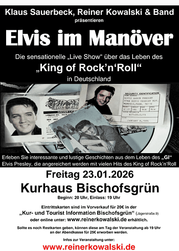 Die sensationelle "Live-Show" über das Leben des "King of Rock´n Roll" in Deutschland Erleben Sie interessante und lustige Geschichten aus dem Leben des "GI" Elvis Presley, die angereichert werden mit vielen Hits des King of Rock´n Roll VVK: 15,00 € Kur- und Touristinfo Bischofsgrün, Jägerstr. 9 oder online unter www.reinerkowalski.de