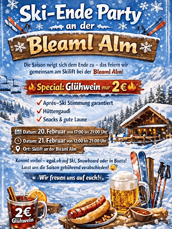 Ski-Ende Party an der Bleaml Alm Die Saison neigt sich dem Ende zu – das feiern wir gemeinsam am Skilift bei der Bleaml Alm! Special: Glühwein nur 2€ Après-Ski Stimmung garantiert Hüttengaudi Snacks & gute Laune Datum: 20.02 17:00 - 21:00 21.02 12:00 - 21:00 Ort: Bleaml Alm Kommt vorbei – egal ob auf Ski, Snowboard oder in Boots! Lasst uns die Saison gebührend verabschieden! *Wir freuen uns auf euch!